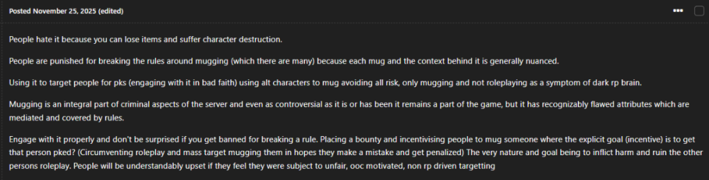 The 'both people are a risk of PK' is the balancing aspect to allow mugging to occur but the reality is that someone can effectively make a fresh char, get a gun (or be provided one) and mug with literally no risk. Whereas the victim is a character with 500+ hours. Every situation is different or nuanced (obviously if you think staff is being biased make a staff report) but no 'revamping' would make it work in a way that would fix the issues (we would have done it) or it would turn it into dark RP mugs with no consequence. /advert mug move or die. The only possible changed I'v toyed with is potentially making mugging a criminal only act, meaning you must be in a crime family to mug someone, but this doesn't really stop alt chars and may encourage certain factions to be mug only faccs (which is good or bad depending on your perspective)