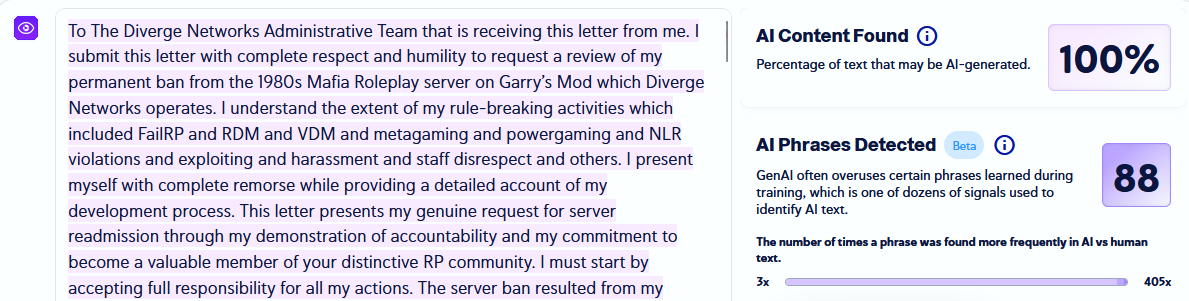 To The Diverge Networks Administrative Team that is receiving this letter from me. I submit this letter with complete respect and humility to request a review of my permanent ban from the 1980s Mafia Roleplay server on Garry’s Mod which Diverge Networks operates. I understand the extent of my rule-breaking activities which included FailRP and RDM and VDM and metagaming and powergaming and NLR violations and exploiting and harassment and staff disrespect and others. I present myself with complete remorse while providing a detailed account of my development process. This letter presents my genuine request for server readmission through my demonstration of accountability and my commitment to become a valuable member of your distinctive RP community. I must start by accepting full responsibility for all my actions. The server ban resulted from my continuous violation of essential rules which harmed the trust between staff members and players and contradicted the fundamental values of your server. My Wrongdoings: FailRP (Fail Roleplay): I broke character rules multiple times through actions that contradicted my character and the authentic 1980s Mafia RP setting. I broke character rules to avoid RP consequences while using OOC information and logic during IC interactions and performing unrealistic actions that harmed the immersive environment which Diverge Networks excels at creating. RDM (Random Death Match): I killed other players without proper RP reasons which led to player frustration and game disruption. The behavior I displayed harmed the roleplaying experience because it broke down the trust that players have in the game's balanced gameplay and storyline. VDM (Vehicle Death Match): I used vehicles as weapons to harm players without following any valid RP guidelines. The action disrupts the game world by removing player agency and narrative progression while being unrealistic for the RP setting. NLR (New Life Rule) Violations: I violated the NLR rule by returning to my death location after resurrection and by using pre-death knowledge to guide my actions during interactions with other players. The practice of ignoring memory wipes and RP continuity rules creates an experience that contradicts the immersive nature of RP servers. Exploiting: I used bugs and glitches to gain personal benefits instead of reporting them to the server administrators. The server's integrity and fairness for all players suffer when players exploit system flaws. Other Infractions: My previous behavior included breaking every fundamental rule of the rulebook through baiting and LTAP and prop abuse and additional violations. My repeated rule-breaking demonstrated my complete disregard for both written rules and the social rules that maintain a healthy RP community. I present these confessions to show my genuine remorse rather than justifying my actions. I share this information to establish trust through complete disclosure about my past actions. The Community Suffered from My Actions My rule-breaking activities caused harm to multiple players who experienced negative impacts from my actions. The community suffered from my rule-breaking because it disrupted the shared storytelling experience that 1980s Mafia RP servers provide to their players. My RDM and VDM actions caused unjustified character deaths to players which led to wasted time and lost creativity and possibly drove some players to leave the game permanently. The staff members had to dedicate their limited moderation time to handle my continuous disobedience which prevented them from supporting the entire community.The server faced multiple rule violations from me which made other players view rule-breaking as acceptable behavior while damaging the detailed collaborative structure Diverge Networks spent time building. A player exists to experience the world, but they must also protect its core values which benefit all users. My failure to fulfill my duties as a player resulted in damage to the staff and player base and the core values of Diverge Networks. Confronting Immaturity and Entitlement My current self must deal with two major issues which are my immature behavior and my belief that I deserve special treatment. The combination of my rule-breaking behavior and defensive reactions when caught now appears completely unacceptable to me. I used to treat the server as my personal playground without understanding its nature as a dynamic social space where creators and moderators work to achieve excellence. The server existed as my personal playground until I discovered its complex nature as a community of real people who worked to achieve excellence. The behavior went beyond being a bad sport because it involved a complete abandonment of the shared duties which sustain enduring online communities. The rules exist to support creative activities and maintain fairness and enjoyment for all players. I have dedicated numerous hours to study both the Diverge Networks server rules and additional resources about positive RP practices across different gaming platforms. I have studied the written reflections from banned players who either regained access to the server or lost their access permanently. The process of genuine growth requires people to shift from denying their actions to taking full responsibility for their mistakes. Through my involvement in roleplay support forums I have learned about how players value immersive experiences and respectful interactions and coherent storytelling. I have learned about collaborative practices and trust development through my dialogues with experienced RPers who have faced previous bans. The practice of assuming another character's perspective which used to be selfish now requires me to show respect for both my own enjoyment and the experiences of others. The understanding of each rule as a product of community wisdom about successful collaborative storytelling has transformed my perspective. Admitting What Can’t Be