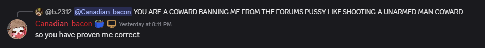 :76561198799680207 Discord:b.2312 Reason for ban: extensive Po's RDM length of ban permanent Appeal: I agree what I did was against the rules and that I should not have killed the man but If you take into account that the man who I killed was not actually RDM and I had past violent Interactions with you will see that this was a false ban and that I was trapped into RDM . After I had gotten into a altercation with the man he decided to come back around to city hall and antagonize me leading for me to kill him might I add that the sit was very one sided in this situation. I believe quite frankly that this is just foolish and that I should not be permanently banned Canadian bacon might not see it this way but this is a unjust ban and I committed no such crime might I add I have gained alot of responsibilty since them and will not troll on this ban appeal and I have nothing to do with anyone who will be trolling on this thread.