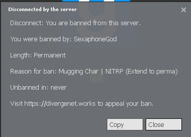 Your Character or Steam Name: Ilikecheese Your SteamID (Click to retrieve): steamid finder isnt letting my get my fuckass id so https://steamcommunity.com/profiles/76561199208840838/ Your Discord ID#: nuggets_11 Reason for ban: Mugging char? and NITRP Length of ban: perma Reason for appeal (dispute/apology): i legit mugged someone ONCE ONE FUCKING time on my char that just so happens to be a civ and i get fucking banned? Why should you be unbanned? Bro i legit mugged ONCE ONE FUCKING TIME on a char that just does jobs around city for money and shit because i cant be bothered to join a faction ffs and the moment i fucking mug someone i get perma'd? What the fuck is this? I'm sure you can understand my frustration when i have to fear mugging some fatass oligarch at the chance of getting perma banned for "Mugging char" so fuckass dude. Additional Information (images, videos, etc): how the fuck am i supposed to get this heres a picture of my ban ig