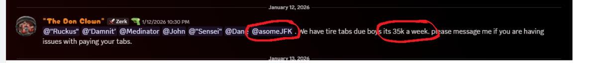 Hello, guy who wrote the orders here. When you became a prospect you were told about the bar tabs. You were fully aware and even paid one on 12/29/2025. When I had this conversation with you in the church, asking you what was going on, I never told you to wait until the deal. Even if I did, the amount you had for the deal would not have been enough for your 70k that you owe. I wrote the orders on this basis. I could give a fuck less about your cop character because, like Riddy said above, we have multiple guys in our faction with cop characters and their actions on those characters do not effect our relationship/our role play on their SoS characters. When we had the conversation, I offered you loa/retirement and you took neither. I also don’t recall you saying anything about paying after the deal. This just is what it is brother. Have hard feelings if you would like. For us, it’s just the role play.