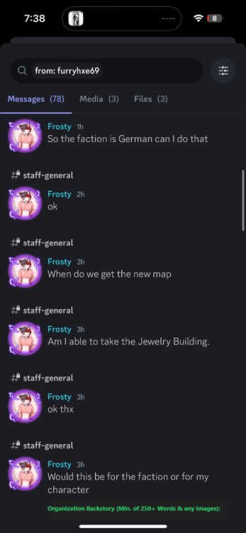 For starters, you asked some pretty dumb questions in staff general, that show that A. You are out of the loop on things, I mean if you dont have the time to read the very short map FAQ announcement then your cooked if you become a faction leader. ( when is map coming??? ) B. You’re not able to answer basic questions without consulting for help. ( can I be German and asking what an organization backstory means, Like come on man ) C. That you think you get special privileges because your staff ( asking if you can get a building assuming you’re going to get accepted ). Furthermore your essay has the reading and writing level of a 4-6th grader and you have done the bare minimum of 255 words for your backstory without even making a document. You have 1 week on the server, not enough time to run a faction at all, I’m fairly confident you have no high command experience, but feel free to share if I’m wrong. Over all, you seem to not be super knowledgeable on the servers current state as well as just general things. You lack experience and time, have put in low effort to this application, and you are a furry. Have a good rest of your weekend, I look forward to your response!1 point