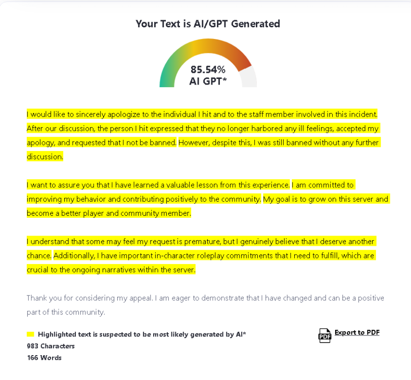 Your Character or Steam Name: MariusModel25 Your SteamID (Click to retrieve): STEAM_1:0:234118864 Your Discord ID#: 1120789101923283015 Reason for ban: VDM Length of ban: 24 Hours Reason for appeal (dispute/apology): I would like to sincerely apologize to the individual I hit and to the staff member involved in this incident. After our discussion, the person I hit expressed that they no longer harbored any ill feelings, accepted my apology, and requested that I not be banned. However, despite this, I was still banned without any further discussion. I want to assure you that I have learned a valuable lesson from this experience. I am committed to improving my behavior and contributing positively to the community. My goal is to grow on this server and become a better player and community member. I understand that some may feel my request is premature, but I genuinely believe that I deserve another chance. Additionally, I have important in-character roleplay commitments that I need to fulfill, which are crucial to the ongoing narratives within the server. Thank you for considering my appeal. I am eager to demonstrate that I have changed and can be a positive part of this community. Why should you be unbanned? ^ Additional Information (images, videos, etc): I forgot to have Medal on but the Staff Member "demig0dd" can confirm...1 point