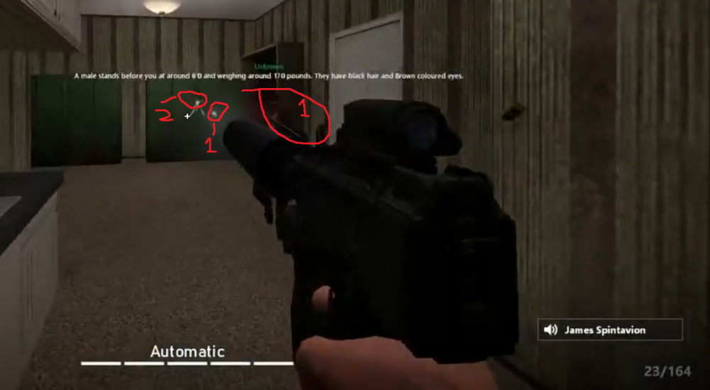 Hello, admin involved with the situation here. I was the "black guy with a rifle". Anyway, I highly suggest all of you do some research on how these things work before commenting. Before I get started on this, whichever staff ends up looking over this appeal, it's littered with this player admitting to multiple other rule breaks. Here's a picture of his gun, after firing 2 bullets. I left my crosshair in the image to provide a clear image as to where his would be (roughly). If you look at the lockers behind the target, you will see both bullets impact behind him. The only bullet that could have possibly hit him, is bullet #1, which is marked in the image below. If you line this up with impact #1, you'll see they don't line up. Now yes, we've seen this many times before, however it's impossible to curve / alter a bullets trajectory to this level. You'll also find another image attached of another person caught in the same situation, who had their appeal denied.1 point