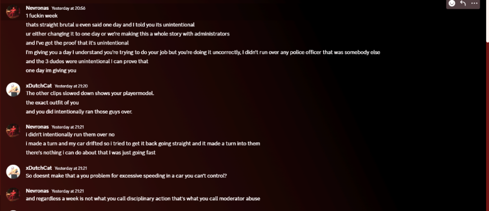 Once again. I've tried explaining to you multiple times. It's a game. Accidents can happen. None of which have been intentional and I even told the people that have been hit that it was an accident. Not my fault that the cars are hard to control, and me speeding has nothing to do with your judgement. Speeding is a crime in the game, which is apart of the RP. Not your business if I speed or not. The whole point is there was no intentional VDM, and a week ban is unacceptable.-2 points