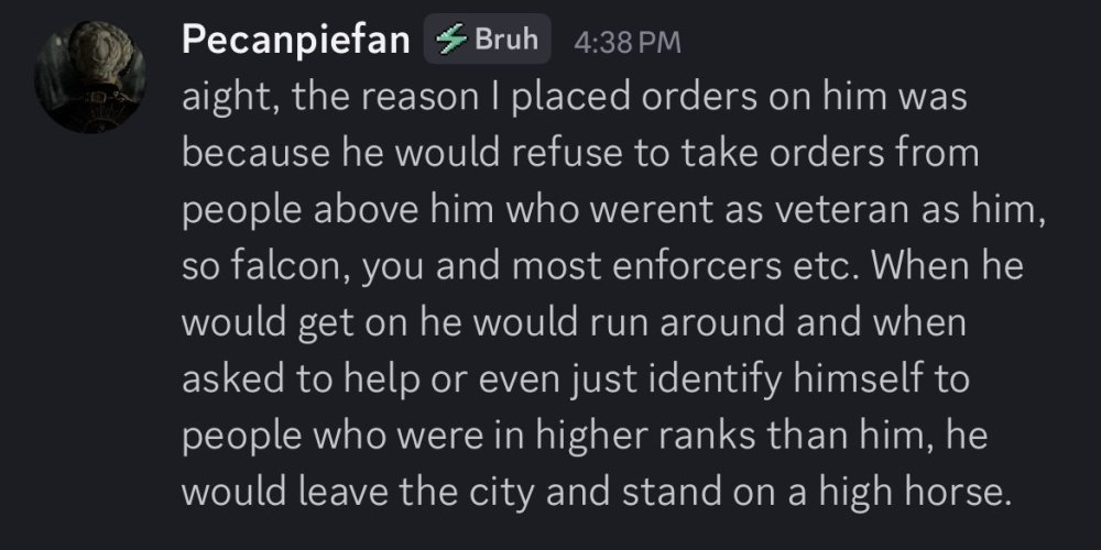 1. In-Game Name(s):Patrick "Mr. Dirty" Hochmeister,Calvino Calabrese,Antonio "Dr. Ricci" Ricci,Senior Officer Ashley Brown,Donnie Nox Steam Name:Mr Clean Steam Profile Link:https://steamcommunity.com/id/2112121/ Steam ID:STEAM_0:0:183124363 Discord Username:deeznutzs. Age:22 When did you first join the server: August 26, 2022 Total playtime on our Servers (Do !time in-game):Your play time is: 8mo 18h 30m Time Zone: Est How much time can you realistically dedicate to moderating?:6+ hours per day Have you read the rules?:yes Do you have a working microphone?:Yes Do you acknowledge that you must meet the weekly minimum ticket quota of 20 tickets? (Unless you have posted a valid LOA):Yes Are you familiarized with SAM and/or Nutscript commands?:No Do you acknowledge that lying on this application will result in immediate denial and blacklisting from staff?:Yes ------------------------------------------------- Long Answer Questions proceeded with an asterix require a response of 3 Sentences Minimum. What is your motivation/reason for applying?: I have many Reasons for applying the main one being that I feel like its my time to apply for staff. I have thought about it many times over the last 2ish years i have played the city. Over that time I have learned the rules of the city and feel like I could be a good staff member. Why should you be considered over other candidates?: i have top 5 playtime so I have seen any rule break that could happen. I have also learned a lot from the people who Recommended me for staff. I am very willing to learn new things. That's why I should be be Considered over other candidates. Do you have any previous staffing experience? (Please list where, what position and how long):fuse point/police rp admin total time 1 year Have you been banned before on any of our servers? If so, why?:No I have not Would you say that you are well known in our community, what's your reputation, what do other members think of you?: I would say that I am well known with in the community. I think a lot of the people in the city know me very well and enjoy talking with me, meaning I have a good reputation. I think people around the server think that i am a friendly person that they can get along with. What is your favorite moment on Diverge so far?:Philly mob event of breaking in to a warehouse killing the guys inside. Then taking the gun shipment they had gotten and leaving. Have any staff members recommended you? If so, list their names:AceAdmiral,xDutchCat,Zqrxz,greenghost,yummekoo,CPT Caboose ------------------------------------------------- Problem Solving Detail step by step exactly the actions you would take. Someone RDMs and you are currently off-duty. How do you handle this?:If I'm not doing anything I would swap to my staff char if there is a ticket for it. But if I'm doing some Role play i would finish it and take the ticket if no one has not taken it already. If it turns in to mass rdm I would stop what i am doing at take the ticket. You have seen a fellow staff member of higher or equal rank than you abusing fairly often, but never doing anything too noticeable. What do you do?:I would get Info like clips ect of what they are doing. If i find anything that i think could be brought up to ua or higher up staff member I would inform them. If nothings found or there's not enough info i would just let them know i have seen them doing it and let them investigate. A member of your faction / friend of yours has a ticket made against them accusing them of RDM’ing, and minging. You know that this person rarely does this when you play with him. How do you proceed knowing this? Does it constitute possible bias?I would avoid the ticket to avoid bias if I knew that this person was in my faction or friend, this will help people get the most fair ruling rather than something that can come off biased. If there was no one else on to take it then I would try to come at it with a very open and neutral headspace. Make sure all the proof is there to make a unbiased decision.