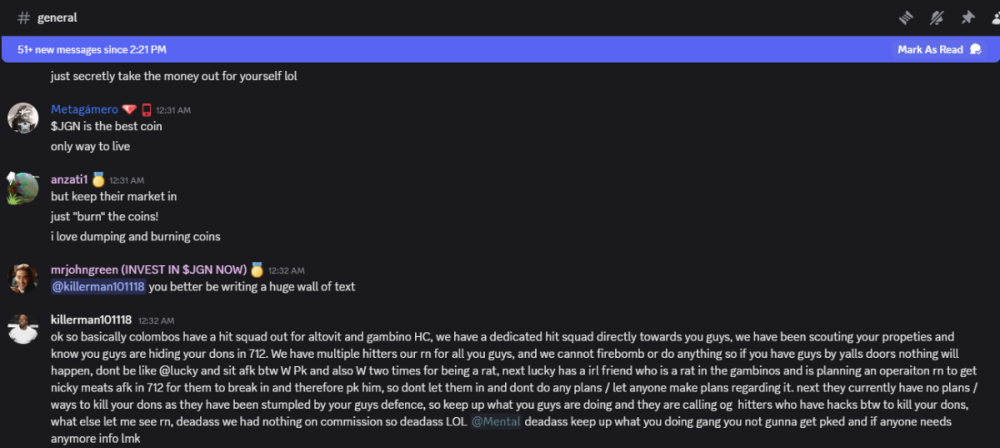 Hey, Don of the faction in which you were pked out of here. Even though I wasn't the one to write the orders personally, I'll leave a little comment for any reviewing staff to see. As Toast already mentioned, the main reason for your death was due to you leaking sensitive information, about which I had heard multiple reports from quite a few of my guys. Rather straight forward there. In regards to all of the other things you mentioned, there is already prior precedent set for pks about messaging a person to meet up with them or to get online not being against the rules. If I can find the specific appeal in which Canadian made that comment, I'll leave it below in another reply. To say that things were communicated and planned OOC would be a lie. As I'm sure you know, I was also on the radio frequency that my enforcer was on with you when you were "looking for someone", and even spoke to you directly on said radio. (You weren't looking for someone, they were just killing you.) Your death was discussed leading to orders being given with myself and a few members of our command in-game also, and was not handled OOCly. I also find it hilarious that the moment you get pked you go on a schizo posting session inside of the diverge general chat on the discord attempting to leak more totally real information that you heard to who you think the targets are and you even end it with "if anyone needs anymore info lmk". (LOL) Oh and did I mention that was only one of the messages you sent? Anyway, I don't think there's anything else that I need to say in regards to this appeal. RIP Antonio Caleno I guess.