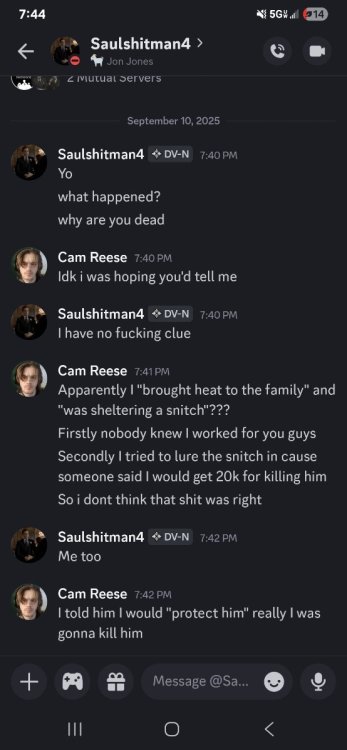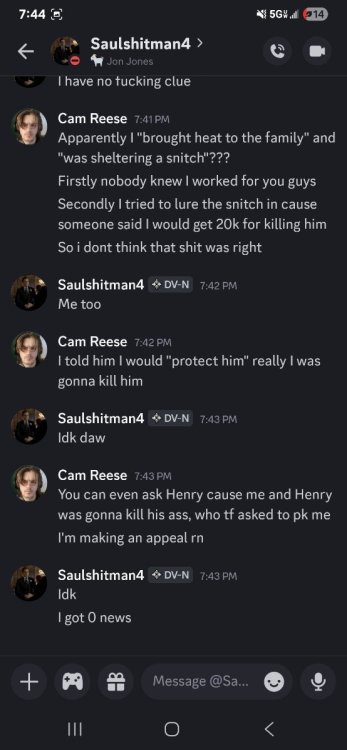 3. Name of Character: Reese Jenkins Character ID: 178900 SteamID: 76561199887738320 Your Discord ID#: 1404580495043334184 Date of PK: 9/10/25 Reason for PK: Apparently I brought heat to the family and sheltered a snitch. Why should you be unPK'd? What server rule or PK rule was violated?: I thought I was supposed to know about my pk before it happened. I didn't bring heat to the family cause no one knew who I worked for. Lastly, I didn't shelter a snitch I put an advert out offering him help to lure him so I could kill him for the bounty that was on his head, Henry Jefferson is my witness on that. The top guy Anton doesn't even know what happened or why it happened. If possible please provide video evidence or photo evidence if PK does not follow the guidelines: i dont record my whole day of gameplay and medal only covers 5 minutes so I couldn't have gotten all of it even if I wanted to but I do got Anton telling me that he dont know what or why ts happened.
