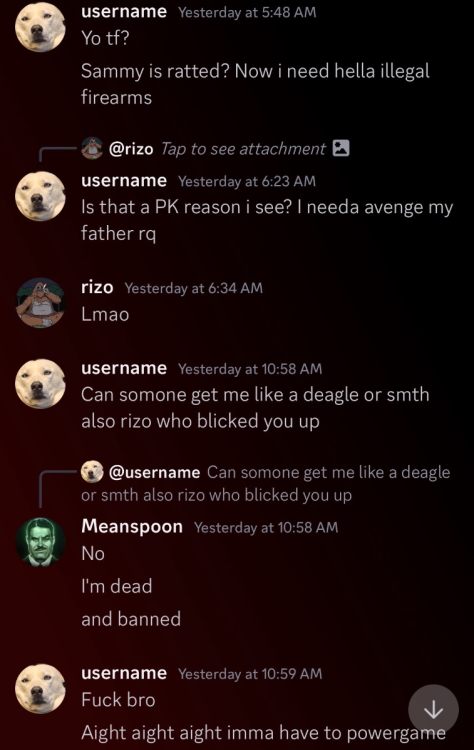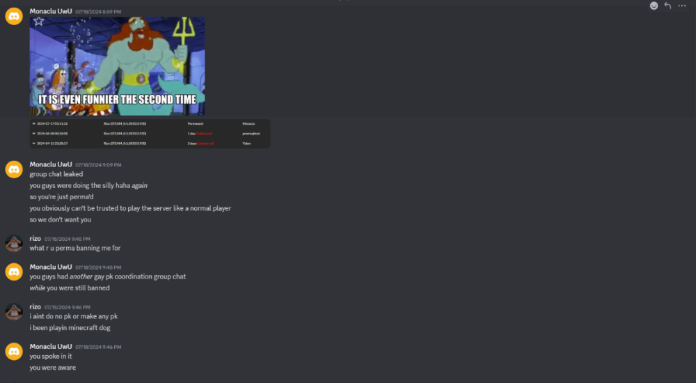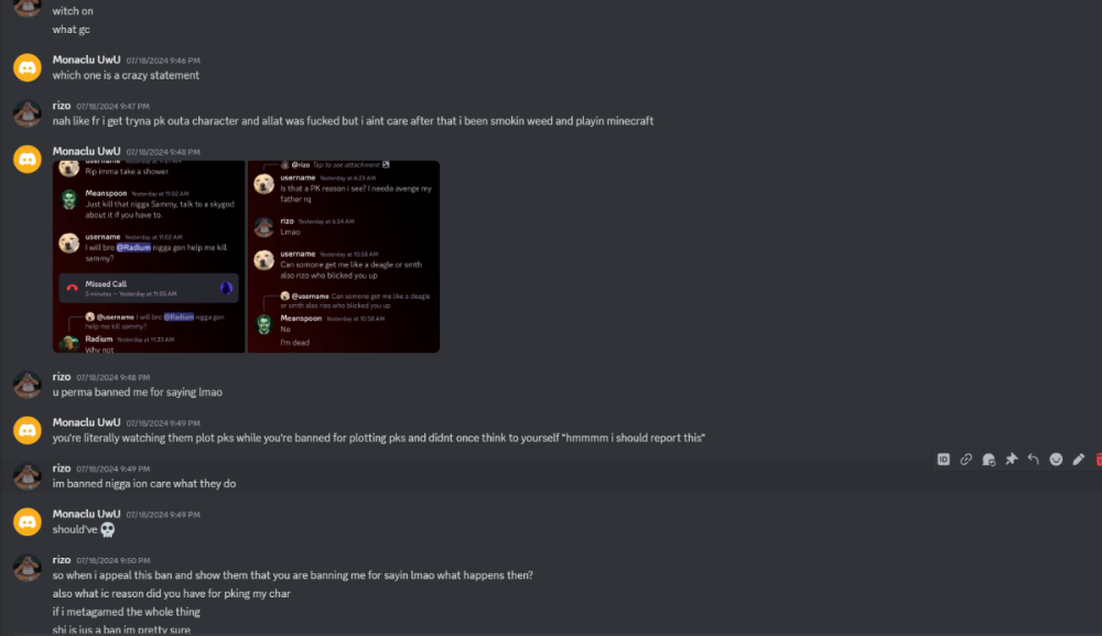 @KingJewMonacluawaiting your response paragraph< 3 1 month later Your Character or Steam Name: Rizo Your SteamID (Click to retrieve): https://steamcommunity.com/profiles/76561198367369589/ Your Discord ID#: .rizo Reason for ban: metagaming po x1 Length of ban: permanent Reason for appeal (dispute/apology): I was wrongfully banned from diverge networks by monaclu for laughing at a joke inside of my freinds gc. Why should you be unbanned? On July 18 2024 I received these messages as seen in section 1 from diverge Super administrator monaclu. for context I was banned and pkd earlier in the week for metagaming. (running a middle command coup with alt chars to get my own crew) as I am waiting for my 30 day ban to end and playing Minecraft. I receive messages from monaclu telling me that I am now permantly banned from the server, as anyone else would be I was quite upset, one of my boys snitched and sent messages from the Rizano family gc to monaclu as seen in section 4. This GC, which was full of my boys that I have been playing on this server with for over a year. (The gc is around a year and 2 months old) So after monaclu sees messages from other members of the Rizanos trying to kill the same guy who snitched originally who got me and my right hand banned for 30 days. He decided the best choice was to ban me who had no involvement in any way shape or form. Now this is the second time in a week that he has banned me. I was completely unaware of any pk attempt after my 30 day ban, for I had taken a sabbatical from the gmoding and left another member in charge. I was completely in the dark until I receive monaclus message that I am perma banned, he pretty much banned me for being in the group chat that I created over a year ago telling me that I should have left or reported it. In truth I had 0 part in this second pk attempt and the reason I am currently permanently banned from diverge networks is because I laughed at a joke (typed Lmao) way before any of these plans were even concieved. as seen in section 4. I have broken zero rules and have not been able to play for over a month now I miss the game I hate monaclu for what he did, I've now wasted my summer not doing what I set out to do (get my own crew in a faction "The Rizano Crew") because monaclu pretty much felt like banning me. I was told to apologize which I'm not goin to do for I have done nothing that warrants an apology. extra shit: He may try to argue that I was typing LMAO in a pk group chat because the screenshots he was sent were cropped, but as seen in section 2 of my evidence you can clearly see that this is untruthful as it was in the Rizanos Group chat. made a staff report that no one could take because it was on a superadmin apparently infiltrating me and friends gc and Scowering to find any incriminating evidence against me (btw his evidence was me typing LMAO to a joke that was completely inside of the rule) Additional Information (images, videos, etc): section 1 monaclu went on to boast about permanently banning me and even blocked me at the end https://imgur.com/a/dxvchHt <----clearer image section 2 proof that i was not typing in any pk groupchat just the group chat that i made over a year ago for my freind group section 3 James completely ignores what I had to say after I wrote in my appeal that all I said was lmao and proceeded to deny me only considering what manacle said and keeping me peramed for literally laughing at a joke section 4 this is what was sent to monaclu and is his only "proof" / "reason" to permanently bannish me from diverge networks fuck monaclu