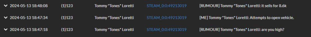 Your priors alone completely disprove you saying you had no idea what you were doing was wrong. After this many notes and bans the fact you haven't even glanced at the rules is honestly a huge red flag. I spent almost 30 minutes explaining to you the situation and yet you still don't seem to understand how what you did was wrong. It was very clear through your mixed and convoluted stories that you were aware your friend was scamming and although you bullshitted that you didnt it wasnt hard to see you were lying. Your mixed story that doesn't align with logs or make sense just proves your statements to be false. https://medal.tv/games/garrys-mod/clips/2d0XvR7Mtl7wzk/d1337Uw4SlHK?invite=cr-MSxBeEYsMTg4NDE1MjQs Here is you trying to set people up through rumour for scams. Below is your buddy trying to sell drugs that he didnt have while being in the car with you. I'll add another post to this thread in a bit with more proof, respond to this for now with your rebuttals.