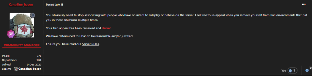 Reason for appeal (dispute/apology): I haven't talked to my friends in a few days, I've left basically every Group chat or server that I'm aware of sharing with them, and I've removed Rizo from my discord friends, Once again, i am sorry for causing trouble, at the end of all this, I just want to play on my cop char again and have fun, i still understand i should've never done what i did, and take full responsibility for what i did. I wasn't sure if this appeal would even be reviewed considering the 6 month cooldown usually applied to perm ban appeals, so deny this if you want i guess, but in my last appeal Canadian bacon , told me to reapply when I've "removed myself from these bad environments" Which i have been working to do, So, thanks for reading this, ill post a screenshot below, and I look forward to my appeal being reviewed.