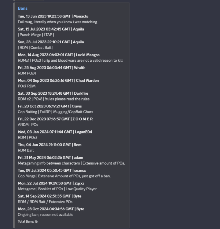First thank you for your support pearce and you do bring up a valid question, To answers your question, I said in my appeal it's not exactly that I need to learn the rules more, its that I need a different set of mind to separate from rule breaking like constantly thinking if my actions would have a negative consequence OOC'ly. People I had done some of these things with such as Susan and Ubersoldaten (Mad Max) can vouch that for a certain time I would deny any invitations to do things strictly because I feared it can or would result in me receiving a warning, note, or ban. An example I can provide is after this clip https://medal.tv/games/garrys-mod/clips/28YAIHQ_KoMgYX?invite=cr-MSxjZmQsNzExMDk4Mjg, although everything had already been committed and all of them died, I immediately expressed a fear of consequence to Young Stroker The Body Snatcher and he assured me that they sought us out but regardless my fear came from the set of mind I expressed which was "Would this get me banned or not" and I can recall saying I won't do anything similar for another month. There had also been numerous of times were I avoided multiple opportunities to commit shootings just because I saw that the circumstances may have seemed too baity. I know I have the capacity to have foresight in my actions but truth be told I can't exactly say whether I will 100% keep a clean record but I do know that if that record is added too, it will result in my removal from this community again. Unless I pay pendred but I know if this is accepted it's going to be like $500 the next time.
