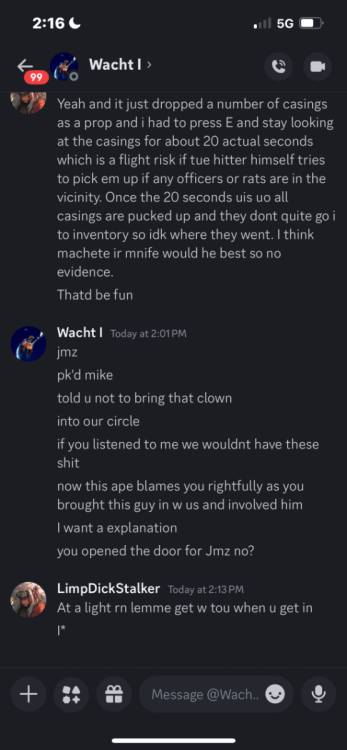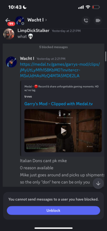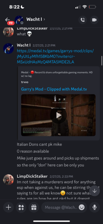 This is no proof of anything this is your hearsay and scrambling to avoid your and your lil rag tag groups metagame as thats the literal only way such an inactive faction would survive. The point being in the time stamp when wacht approached me OOCly w mikes death directly after his death means that an individual IC went and told this OOC individual who had not even been online in weeks but to hop in After hearing ooc someone got hit. Very clear, not hard to understand. Youre scrambling for a bullshit excise which isnt plausible as you have no actual proof of anything of your claims. We have legitimate proof of conversation regarding the death as well as the clip that was shared from the death from the eyes of the dead man which was sent ooc to another individual which lead to IC roleplay events. If its too advanced to get through that thick skull just go back to peeling potatos. Here is a screenshot of a clip sent to me minutes after this man was killed, when. Nobody was around the event to have knowledge, which was sent to me by a third party in which the video was shared, oocly. Which was also sent to me oocly which lead to ICly events. W details and everything on a dead mans death. How exactly did this man get details on a mans death when he wasnt even logging in on his character in the city? Since you have so many explanations, lets hear what you have for this one. Here is the link in reference, sent directly from a dead mans eyes from death to an ooc don to an ooc underboss in private dms, not on IC company pager (even then the dead mans final 15minutes are inadmissible for your readons) https://medal.tv/games/garrys-mod/clips/jMyUtLyMfh158KbM0?invite=cr-MSxUdHAsMzQ4MTA5MDE2LA how much of this is also not metad in your twisted perspective?