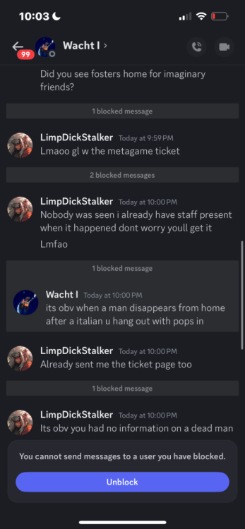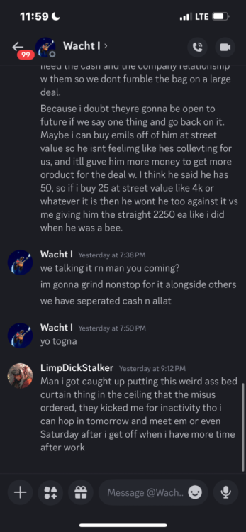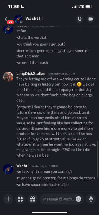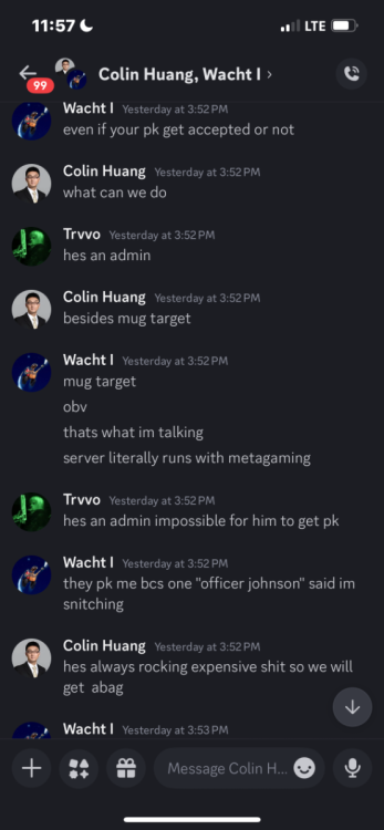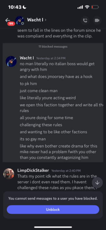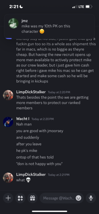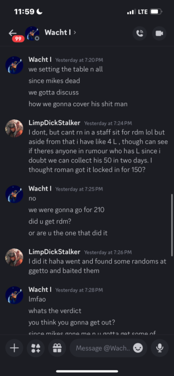 Rules: You may only make one appeal per PK, if you are denied you will be unable to appeal for that character again. You must appeal within one week of your character being PK'd, appeals posted after this time will be automatically denied. You may only comment on an appeal if you were DIRECTLY involved with the situation leading up to the PK. Replies that are not relevant to the situation will result in a forum warning and/or ban. You must follow the provided template for the appeal, failure to do so will result in an instant denial. Name of Character: Ranticus Dracul SteamID: 76561198172421441 Your Discord ID#: LimpDickStalker Date of PK: 2/28/25 Reason for PK: Metagame Why should you be unPK'd? What server rule or PK rule was violated?: These individuals of the Basarabs conspired in private messages to confirm a man was dead; with the dead man, and resulted in me being set PK active when the individuals who set this character for PK had no IC knowledge of this mans death or the reason IC for his death. The man was murdered, then he ran and immediately cried in the dons dms about dying which caused him to request an appeal to see the reason, which then lead to them obtaining information OOCly about an IC event that had happened. Here are some photos for their OOC conversations which lead to IC rp events. Please note the last messages where wacht claims to know that jmoorsey PKd Mike, when mike just hot murdered in character. Wacht then demotes character for said event, and then sets pk active, resulting in character death from information gained from a dead man in a private ooc dm. You also see where he asks me ooc to meet him IC. If possible please provide video evidence or photo evidence if PK does not follow the guidelines: