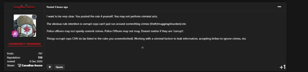 i think you misunderstoond, on this post you commented on corruption and how its unclear. Your exact quote was, What I commented in return was mentioning how you were already explained the corruption rules. Just because it was a different post doesn't invalidate the fact they told you. At this moment, the second post i quoted was made 19 hours ago, the canadian bacon post i screenshotted and sent that explained the rules was sent 23 hours ago. You even replied. When I commented asking whether or not you were already explained these rules, you lied and said no. My entire point in commenting was to call out how you said you believed corruption is unclarified, despite being clarified about these rules hours prior. I would also like to ask for where it says, "no corruption at all." This isnt stated in rule 11 of corruption rules.