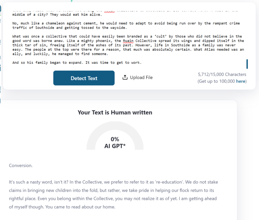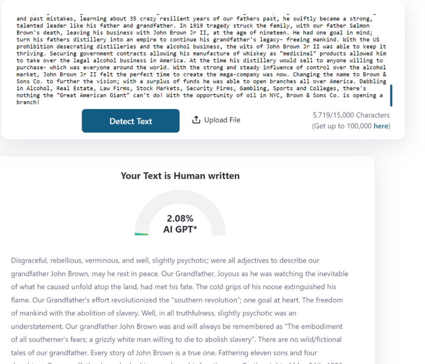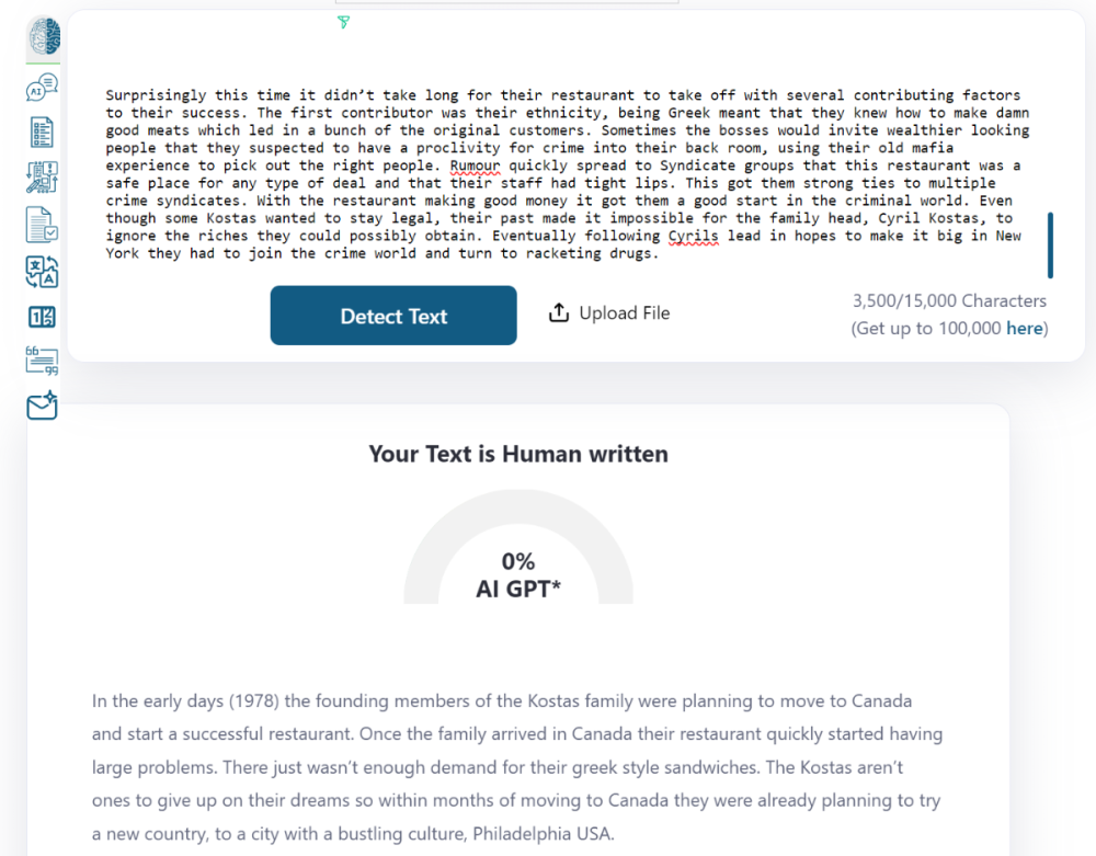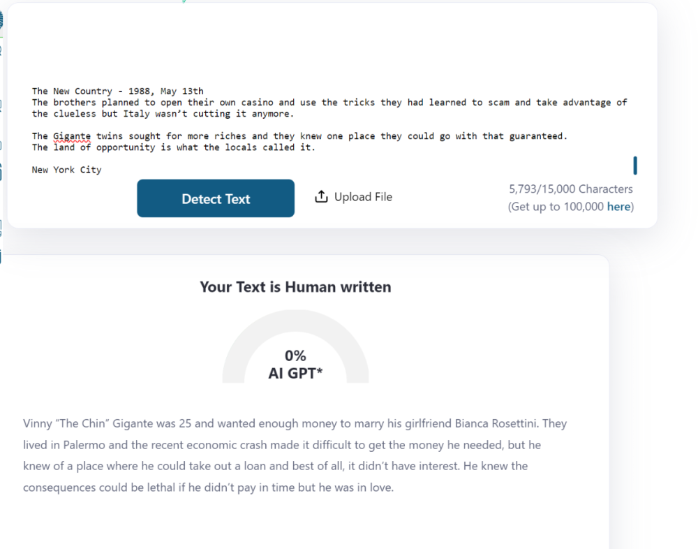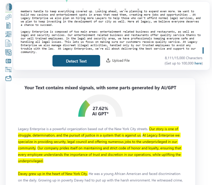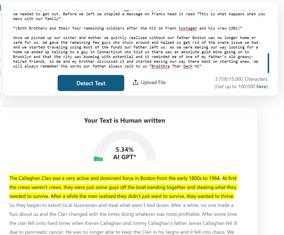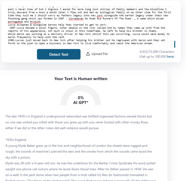 11. There's a multi-quote button you could've used instead of responding to four people separately with the exact same copy-pasted statement. I did my own research on multiple AI checking sites before agreeing with the AI sentiment because I'm not someone who says things without research. If you're going to double down on these things, that's perfectly fine, it's a free world in most places. Just please be sure that you're right in this exchange. Kostas Crime Syndicate: The Callaghan Clan: The Ruain Collective: Brown & Sons Co.: Corredores Do Road: The Cassano Crime Family: Legacy Enterprise: No other application even comes close to flagging as much AI usage as you have. I'm not going to claim you used 100% of this for AI, that'd be stupid. However, I have reason to believe you've definitely used AI to forge this backstory far more than literally any other application on the site right now. I have taken the liberty of getting your entire backstory off of those slides so that others can do their own research going forward as well. It will be seen at the bottom of this post. If you truly did not use AI, you type in a manner that heavily resembles AI and that's.. difficult to do on accident. You have chosen the double down route, so I won't argue further. I'll let others do their research with what's been provided and come to their own conclusions.