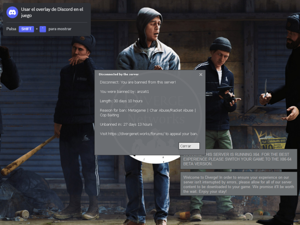 It's very disgusting that you are making screenshots of this conversation separately and trying to organize it in a way that makes me seem guilty. Theres the welcome message where you can see that i just join the discord group and there's the message where they are saying that is a OOC conversation wich has nothing to do with the game, Theres my hello message and there's my last message that i sent on that group. Being i'm a discord group doesn't make me guilty, it's like being on the diverge chat. Please this is very disgusting you maybe kick me from the discord group and know you thought that i couldn't get this ss but it was shared on the diverge channel so everybody already saw this. There's the welcome message and there's the last message i never sent any video because i couldnt cut it for being to big and didn't had the time to dowload an applicattion. All those messages doesnt show metagaming and i wasnt online when i sent those messages. Please i would like you to show evidence of me saying anything that proves that i was doing metagaming because this only proofs that people talking about the game but i wasn't talking on discord, i would use discord only to keep their contacts so we can join together at the server. If they were talking on the server it's ok you can ban them but even i didnt answer any of those messagges and didnt sell anything or bought anything from them, didnt use the information that they provide on discord at my favor as i didnt knew about what they were doing. You are assuming that i did something that i havent. Didnt bought anything from what they offer or create an alternative character to abuse factions racket as you said. I wasn't doing cop baiting, wasn't mugging multiple people and wasn't trying to get random money from cops i was trying to pay a bail for my friend so he can go out from jail. I believe banning by only assuming it's not right. There's no evidence of me doing anything you said and my messaggees were all ooc as said (screeshot attached). I have evidence where they give me the radio frequency on video and also ongame so if you are banning me by that i would be happy to screen share my video on the part where im roleplaying and they give me the radio frequency as it should be. Didnt took anything from discord only use it to chat like i would do on other discord groups with friends. Didnt do cop baiting, if mugging means killing it was self defense, i have the video that i didnt uploaded for being too big but if needed i can show you, just ask for it. Also all that day it's recorded so ask if you need but only to prove my innocence. Everything said on the discord group before i joined them has nothing to do with me, please let me know how we can solve this issue. Have a nice day.