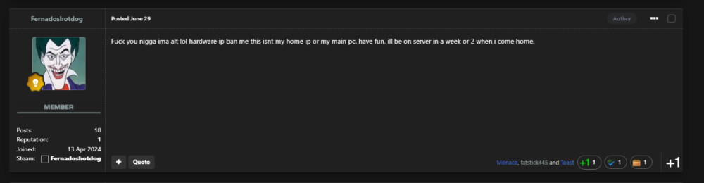CONSOLE Ban length changed to permanent due to ban evasion attempt on SteamID, STEAM_0:0:701399968 2024-06-29 19:53:03