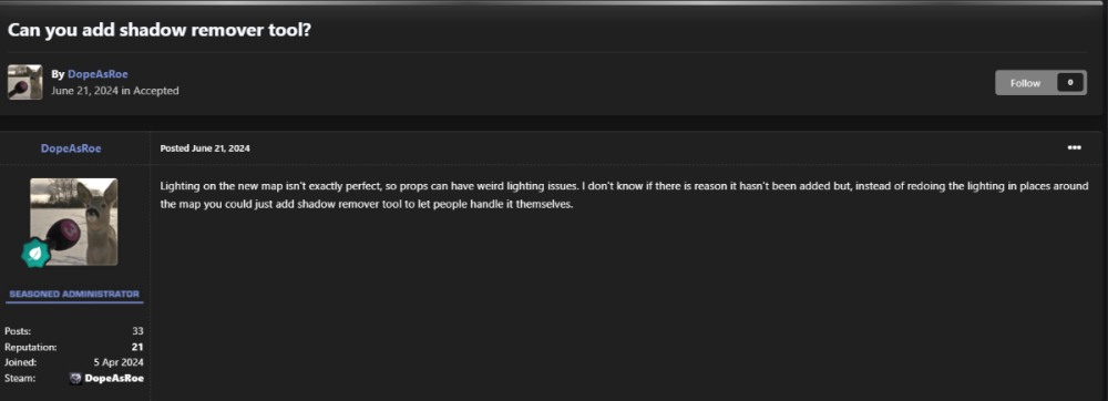 Lighting on the new map isn't exactly perfect, so props can have weird lighting issues. I don't know if there is reason it hasn't been added but, instead of redoing the lighting in places around the map you could just add shadow remover tool to let people handle it themselves.